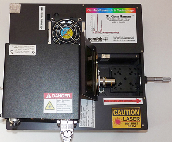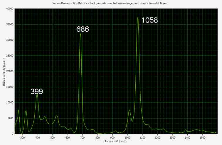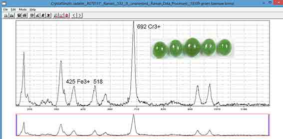 Een Raman spectrometer is gebaseerd op zwak "strooilicht" en gebruikt als lichtbron laserlicht van bijvoorbeeld 514, 532 of 780 nanometer. De GL Gem Raman heeft een groene laser van 532 nm. De weergave van onderstaande jade is met het gratis softwareprogramma CrystalSleuth (zie 8.Downloads).